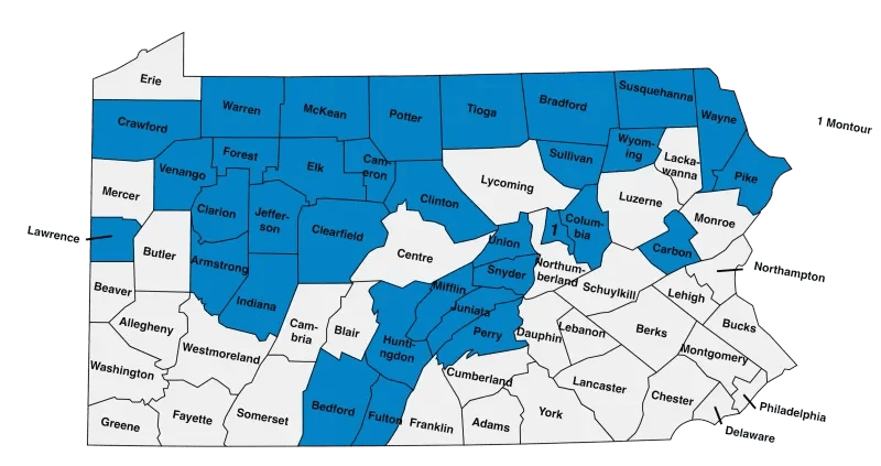 Armstrong, Bedford, Bradford, Cameron, Carbon, Clarion, Clearfield, Clinton, Columbia, Crawford, Elk, Forest, Fulton, Greene, Huntington, Indiana, Jefferson, Juniata, Lawrence, McKean, Mifflin, Montour, Perry, Pike, Potter, Snyder, Sommerset, Sullivan, Susquehanna, Tioga, Union, Venango, Warren, Wayne, Wyoming