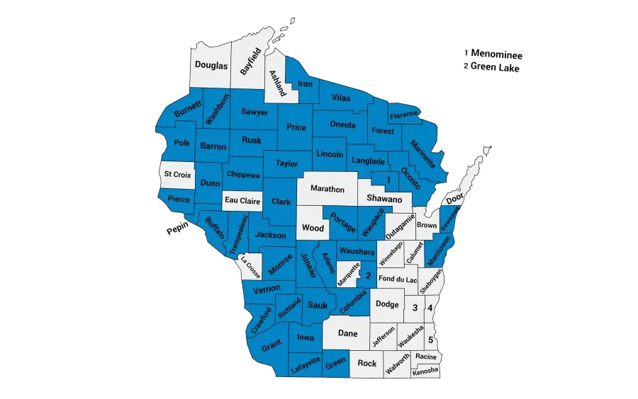 Adams, Barron, Buffalo, Burnett, Chippewa, Clark, Columbia, Crawford, Dunn, Florence, Forest, Grant, Green, Green Lake, Iowa, Iron, Jackson, Juneau, Kewaunee, Lafayette, Langlade, Linkcoln, Manitowoc, Marinette, Menominee, Monroe, Oconto, Oneida, Pepin, Pierce, Polk, Portage, Price, Richland, Rusk, Sauk, Sawyer, Taylor, Trempealeau, Vernon, Vilas, Washburn, Waupaca, Waushara